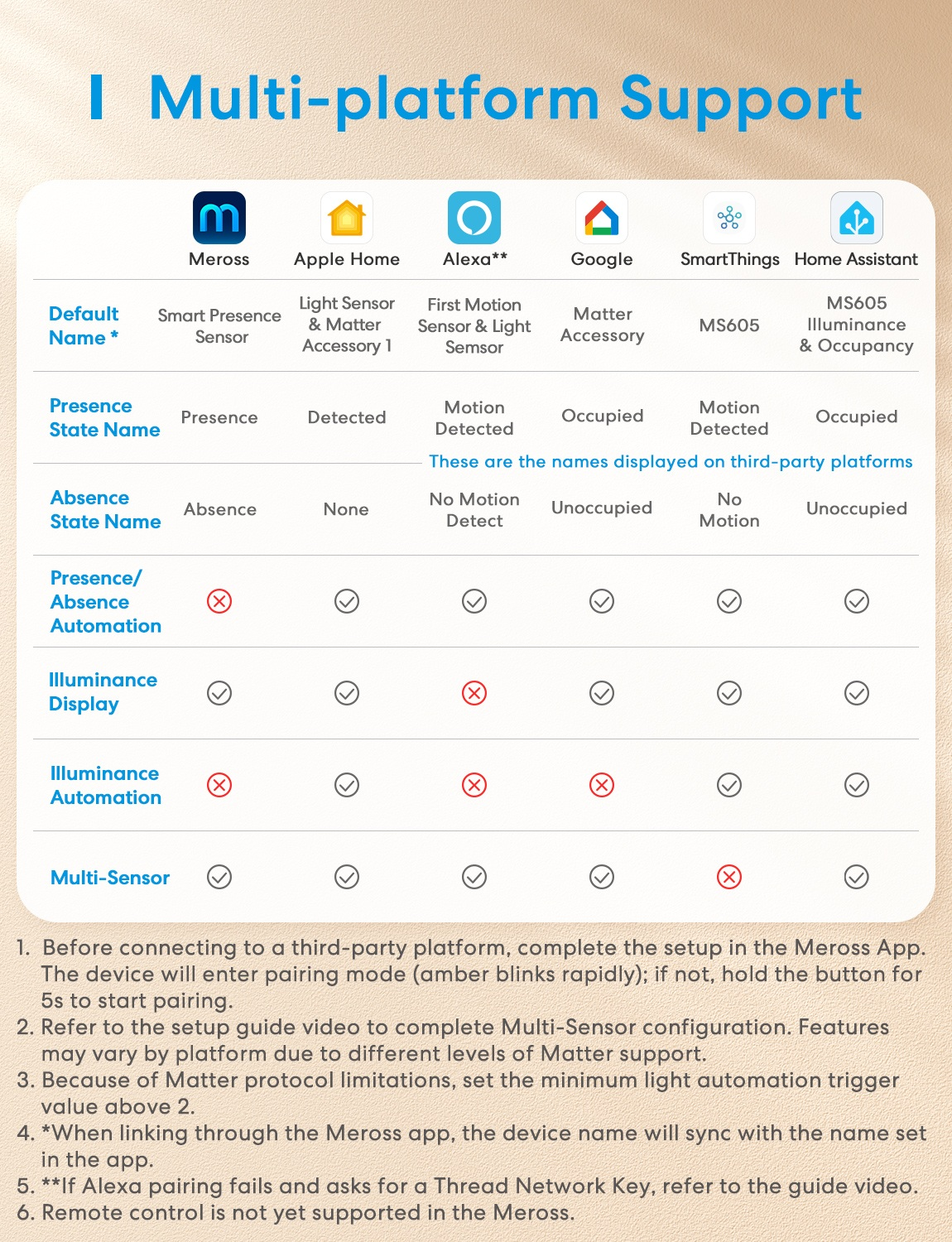 若要將此裝置新增至支援 Matter 的第三方平台應用程式(例如 Apple Home、Alexa、Google Home),請確保您擁有一個同時支援 Matter 和 Thread 的智慧家庭中心。 該設備透過手機上的藍牙與 Meross 應用程式配對並完成設定。使用第三方平台時無需 Meross 智慧家庭中心。如需使用 Meross 應用中的遠端控制和進階功能(例如自動化),則需要 Meross 智慧家庭中心。 Meross 智慧家庭中心目前正在開發中,預計將於 2026 年第二季上市。 Meross 智慧人體感應器採用最新的 Matter over Thread 協議,搭載先進的 Nordic 晶片組,並配備長效電池,安裝靈活。它結合了毫米波雷達和紅外線運動偵測技術,能夠精準感知細微的動作和人體存在。此外,它還配備了即時光感測器,可監測環境亮度並將變化即時報告給 Matter 平台。 全場景靈活安裝:配備 90° 可折疊 + 360° 可旋轉支架,可依需求安裝在天花板、牆壁或角落。內建 3 年鋰電池(CR123A,已包含)和 IP67 防水等級,可在 -20°C 至 +60°C 的溫度範圍內可靠運行,開箱即可使用。無論是在潮濕的浴室、寒冷的地下室或炎熱的閣樓,它都能完美運作。可偵測 6 公尺範圍內的移動物體,並在 4 公尺範圍內精確偵測人體存在,非常適合各種大小的房間,例如書房或臥室。 三合一智慧感應技術:告別傳統單一感測器的誤觸發!採用雷達、紅外線和光線感應三重偵測技術,確保更準確可靠的偵測結果。 ꔷ 毫米波雷達可偵測細微的微小動作(例如呼吸時的胸部起伏)。 ꔷ 紅外線感應器可過濾掉窗簾或掃地機器人等非熱源運動。 ꔷ 光感應器支援智慧照明控制(注意:Alexa 目前不支援光感應器)。 三重檢測技術讓您的智慧家庭真正感知您的存在。 全屋智慧整合:支援 Matter over Thread 直接連接 Apple HomeKit、Alexa、Google Home、SmartThings 和 Home Assistant,無需額外的網關(例如 Meross MSH450)或 2.4GHz Wi-Fi。體驗低延遲本地控制:起床時夜燈自動開啟,回家時燈光和空調立即啟動。 Matter 本地控制意味著更高的安全性—您的資料始終保持私密,即使沒有網路連線也能正常運作。 三區智慧場景控制:在 Meross App 中將偵測範圍劃分為三個可自訂區域。每個區域都可以獨立設定存在/不存在條件,並在第三方平台上顯示為單獨的感測器,以實現高級自動化。例如:書房:5 公尺 → 主燈開啟;2.4 公尺 → 檯燈開啟。浴室:6 公尺 → 夜燈開啟;4 公尺 → 浴室燈亮起;1.6公尺內停留1秒 → 鏡前燈亮起。智慧型偵測、精準感應、靈活安裝-集所有功能於一身! 無需Meross Hub:透過Meross App快速完成藍牙設置,即可輕鬆實現精細化的個人化設備配置,然後透過相容的Thread Border Router連接,在您首選的平台(Alexa、Apple Home、Home Assistant等)上本地私密運行——無需Meross Hub或持續使用App。